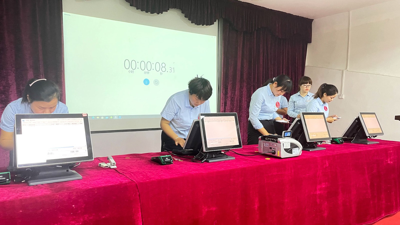 首次進(jìn)行的比拼項(xiàng)目是來(lái)自財(cái)務(wù)部的收銀科,他們比賽的項(xiàng)目有點(diǎn)鈔比賽、驗(yàn)票及條碼錄入、結(jié)賬服務(wù)。第一輪點(diǎn)鈔比賽環(huán)節(jié),選手們個(gè)個(gè)熱情高漲,實(shí)力也是不相上下;接下來(lái)是驗(yàn)票及條碼錄入比賽環(huán)節(jié),參賽選手們?cè)诒荣愡^(guò)程中沉著冷靜、眼疾手快,每位選手都需要對(duì)10張小票進(jìn)行篩選,然后再錄入系統(tǒng),并且還要找出錯(cuò)誤的地方,最終進(jìn)行核對(duì),現(xiàn)場(chǎng)響起了一片敲擊鍵盤(pán)的聲音。隨后是結(jié)賬服務(wù)比賽環(huán)節(jié),選手都是按照標(biāo)準(zhǔn)的結(jié)賬流程和服務(wù)用語(yǔ)進(jìn)行操作。