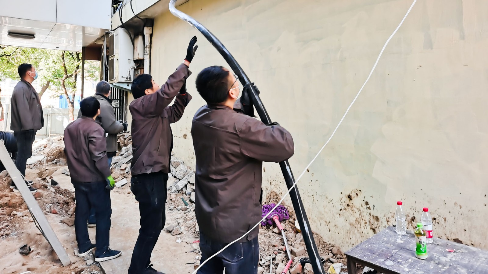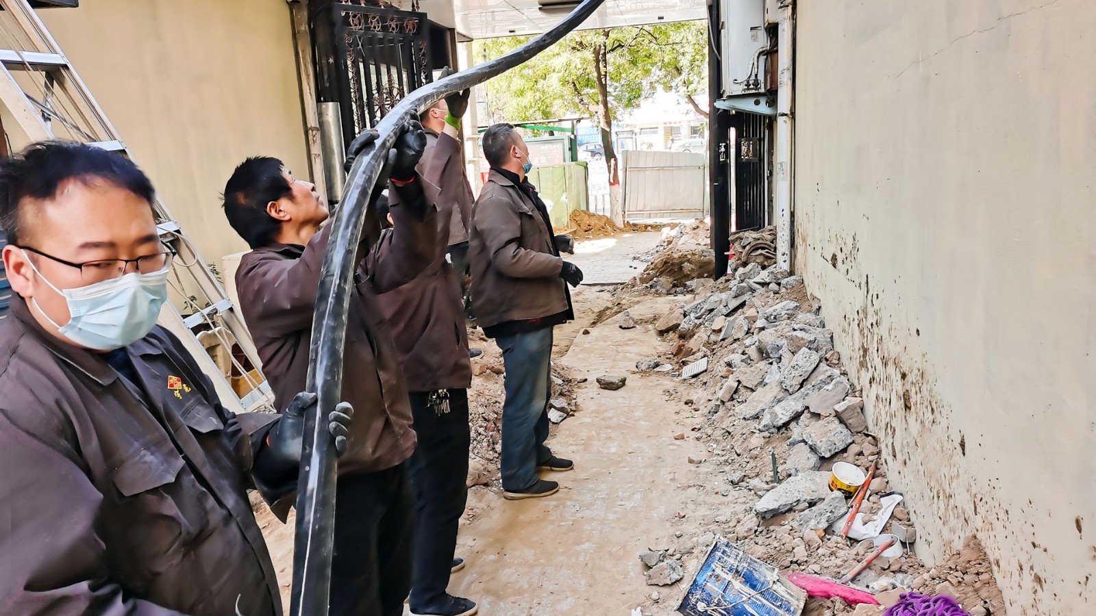 兩條4乘300的主電纜跨越了3層住宅樓的高度,連接配電室和一樓總電源柜,現(xiàn)場(chǎng)環(huán)境非常復(fù)雜,作為主電纜,這兩根近似胳膊粗的主電纜只能靠人工一米一米地慢慢拉。